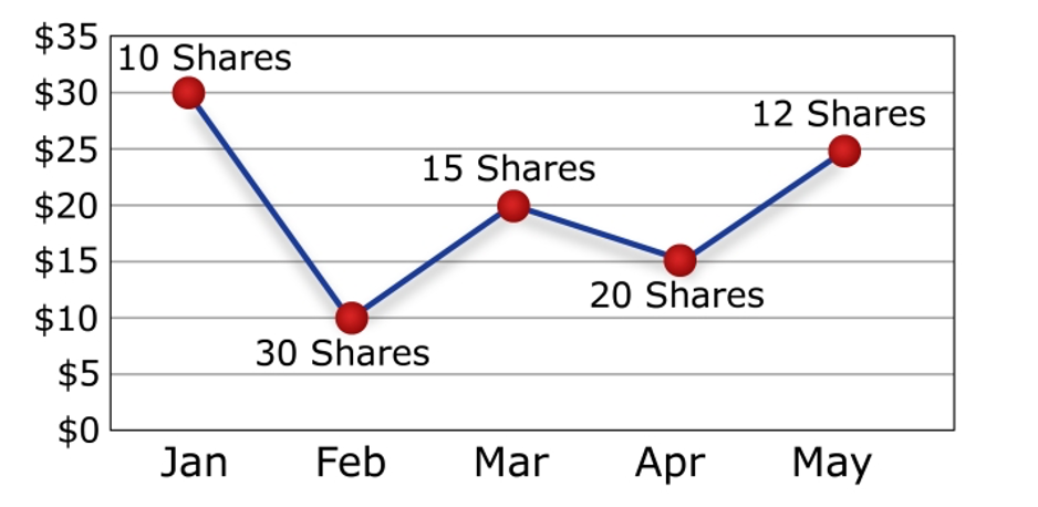 The accompanying graph illustrates how share price fluctuations can yield a lower average cost per share through dollar-cost averaging. In this hypothetical example, ABC Company's stock price is $30 a share in January, $10 a share in February, $20 a share in March, $15 a share in April, and $25 a share in May. If you invest $300 a month for 5 months, the number of shares you would buy each month would range from 10 shares when the price is at $30, to 30 shares when the price is $10. The average market price is $20 a share ($30+$10+$20+$15+$25 = $100 divided by 5 = $20). However, because your $300 bought more shares at the lower prices, the average purchase price is $17.24 ($300 x 5 months = $1,500 invested divided by 87 shares purchased = $17.24).
